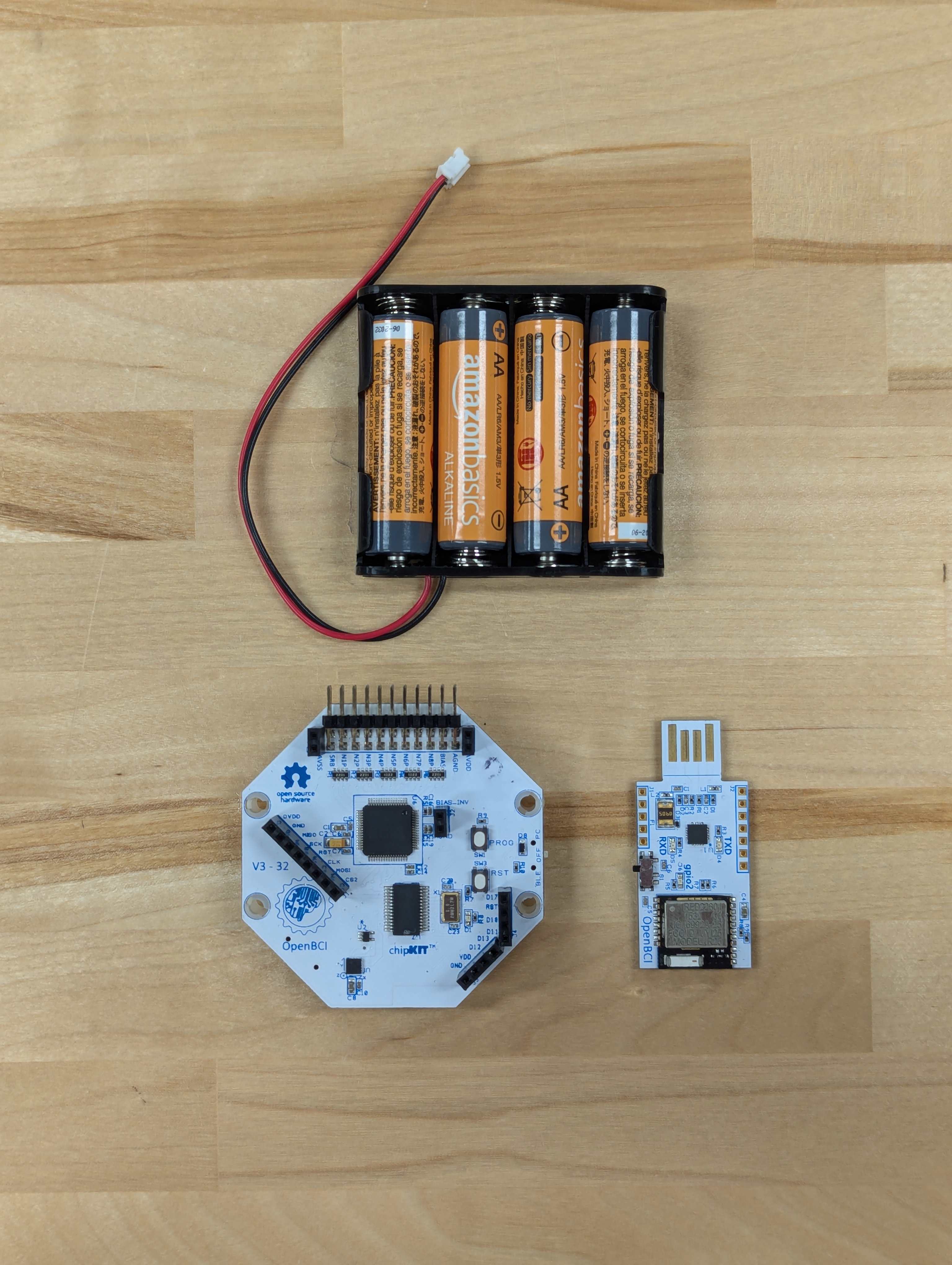 Make sure you have your Cyton Board, Dongle, and Battery Pack with 4 AA batteries.